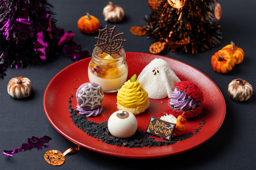 1年に1度のにぎやかな装いのハロウィンシーズンにご用意するのは、秋らしい味わいのスイーツ6種を盛り合わせにした「ハロウィンプレート」。やさしい甘み“かぼちゃのモンブラン”を中央に、くもの巣のチョコレートを飾り付けた“サツマイモのパンナコッタ”、求肥クレープで愛らしいおばけに見立てた“バナナムース”、“ヨーグルトムースのアイボール”、ハロウィン仕立ての“紫芋のシュークリーム”と“ブドウのマカロン”を一皿ににぎやかに盛りつけました。 キュートで心がドキドキ・ワクワクするハロウィンスイーツとともに、楽しいひとときをお過ごしください。