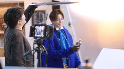 「紅茶花伝」を象徴するロイヤルブルーの妖精衣装に身を包んだ八木さん。長い丈の衣装もさらりと着こなし、スタイルの良さが際立ちます。撮影が始まると監督の指示を真剣な眼差しで聞きながら、集中した演技により、短いカットで次々とOKを連発。カット後はスタッフと談笑するなど、リラックスした様子も見せていました。時には「紅茶花伝 ロイヤルミルクティー」というセリフを噛んでしまう場面もありましたが、八木さんの柔和な人柄と高い集中力が、温かくスムーズな現場の雰囲気を作り出していました。